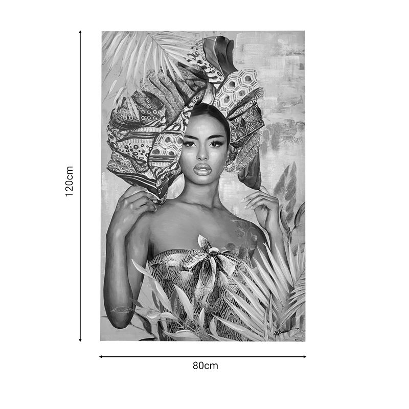 Жената е представена с изискани черти, като сивите цветове подчертават основната интензивност и вътрешна сила на фигурата.Спецификации:*100% картина върху платно*Изработена от полипропилен*Предлага се в сиво-бежов цвят