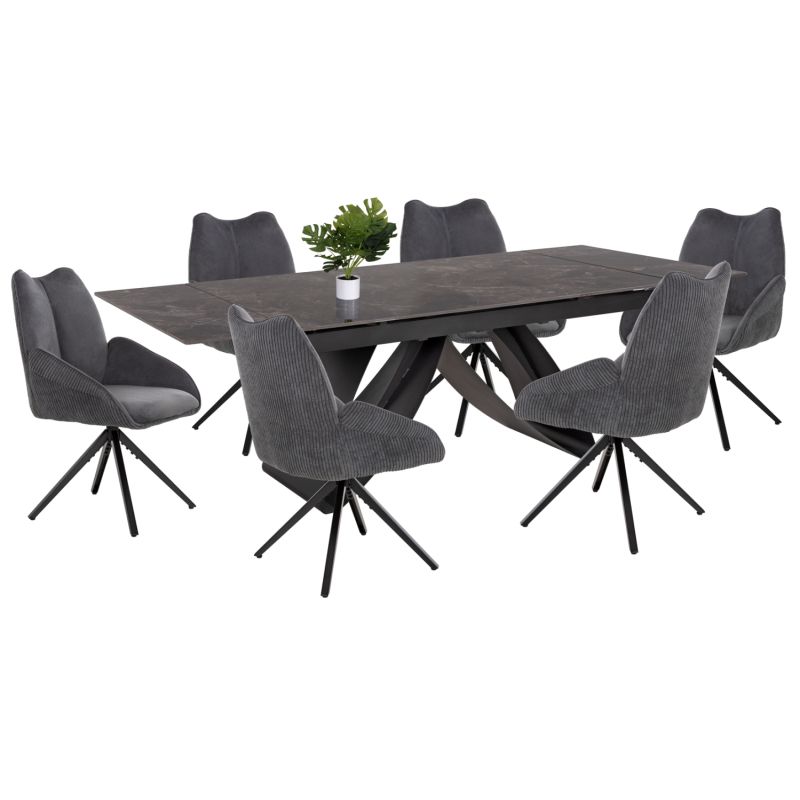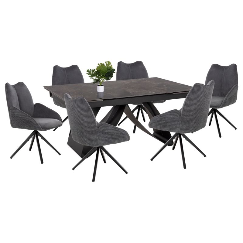 Tрапезен комплект TEGATT предлага луксозна визия за трапезарии, обзаведени в модерен стил или стил артдеко. Сетът се състои от разтегателна трапезна маса с красив керамичен плот и 6 фотьойла. Масата променя дължината си, като плотът се разтяга от 180 до 260 см. Той е с дебелина 1,1 см, гланциран, в цвят ЧЕРЕН МРАМОР. Краката на трапезната маса са метални в ЧЕРЕН цвят.