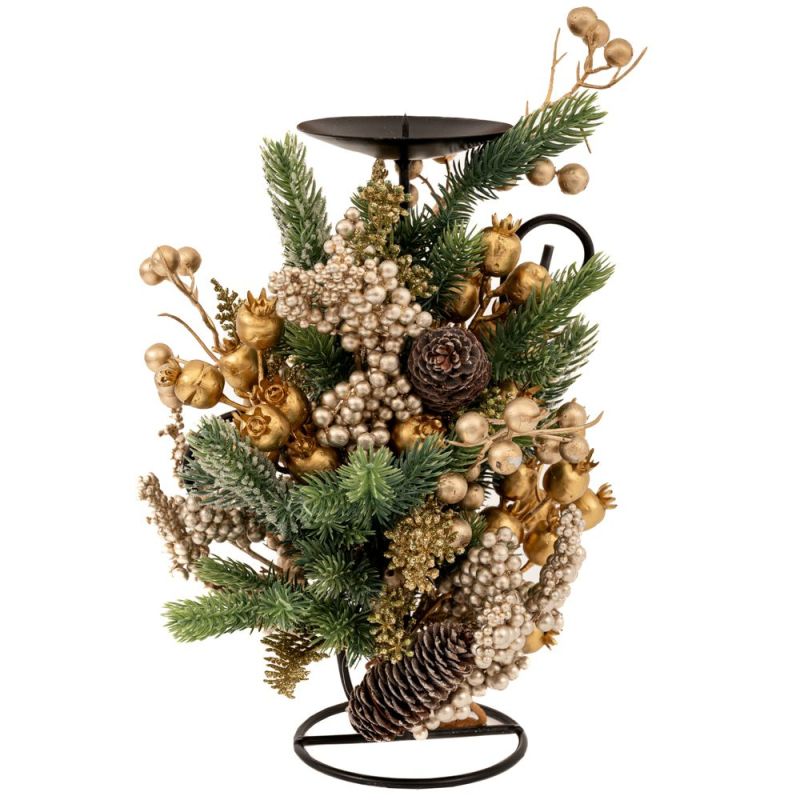 ЗЕЛЕН СВЕЩНИК С ШАМПАНСКИ ПЛОДОВЕ И БОРОВИ ШИШАРКИ 33 СМ