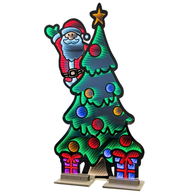 120 СМ СТОЯЩА КОЛЕДНА ЕЛХА С СВЕТЛИНА И ФИГУРА НА ДЯДО КОЛЕДА, С ДЪРВЕНА И АЛУМИНИЕВА ОСНОВА, ДВОЙНО ЛИЦЕ, ОСВЕТЕНО ОТ ДВЕТЕ СТРАНИ И ЕВРОПЕЙСКИ ЩЕПСЕЛ.
