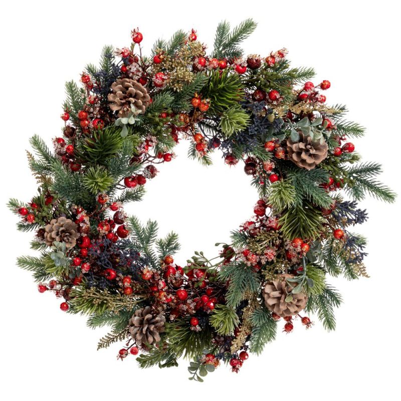 ЗЕЛЕН ВЕНЕЦ С ЧЕРВЕНИ ПЛОДОВЕ И БОРОВИ ШИШАРКИ 50 СМ