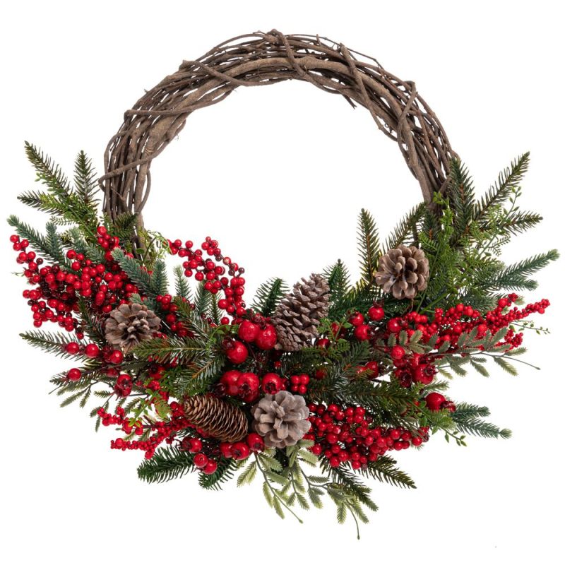 ЗЕЛЕН ВЕНЕЦ С ЧЕРВЕНИ ПЛОДОВЕ И ШИШАРКИ ОТ БОР 50 СМ
