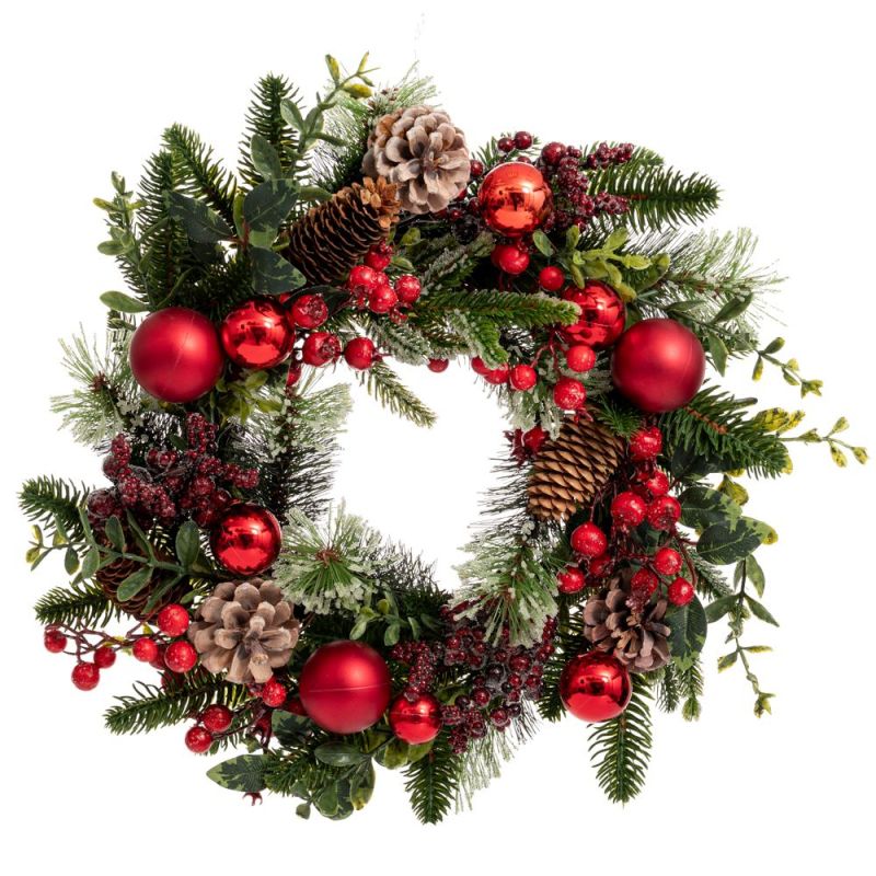 ЗЕЛЕН ВЕНЕЦ С ЧЕРВЕНИ ПЛОДОВЕ, ЧЕРВЕНИ ТОПКИ И ЗАМРАЗЕНИ ШИШАРКИ Φ40СМ