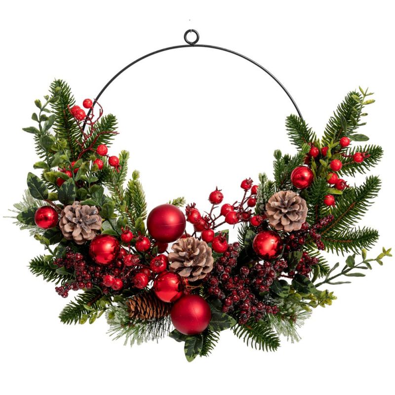 ЗЕЛЕН ВЕНЕЦ С ЧЕРВЕНИ ПЛОДОВЕ, ЧЕРВЕНИ ТОПЧЕТА И БОРОВИ ШИШАРКИ 30 СМ