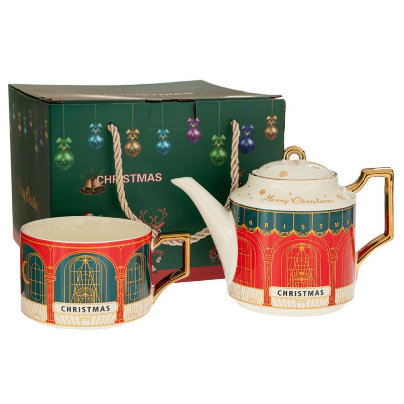 КОЛЕДЕН КОМПЛЕКТ ОТ 2 ЗЕЛЕН, ЧЕРВЕНИ КЕРАМИЧНИ ЧАЙНИКА С ЧАША И ЧИНИЯ