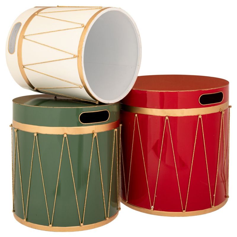 КОЛЕДЕН КОМПЛЕКТ ОТ 3 ЧЕРВЕНО-ЗЕЛЕНО-БЯЛО МЕТАЛНИ КУТИИ С ДИЗАЙН НА БАРАБАН 45Х44,5 СМ 40,5 СМ 34Х36 СМ
