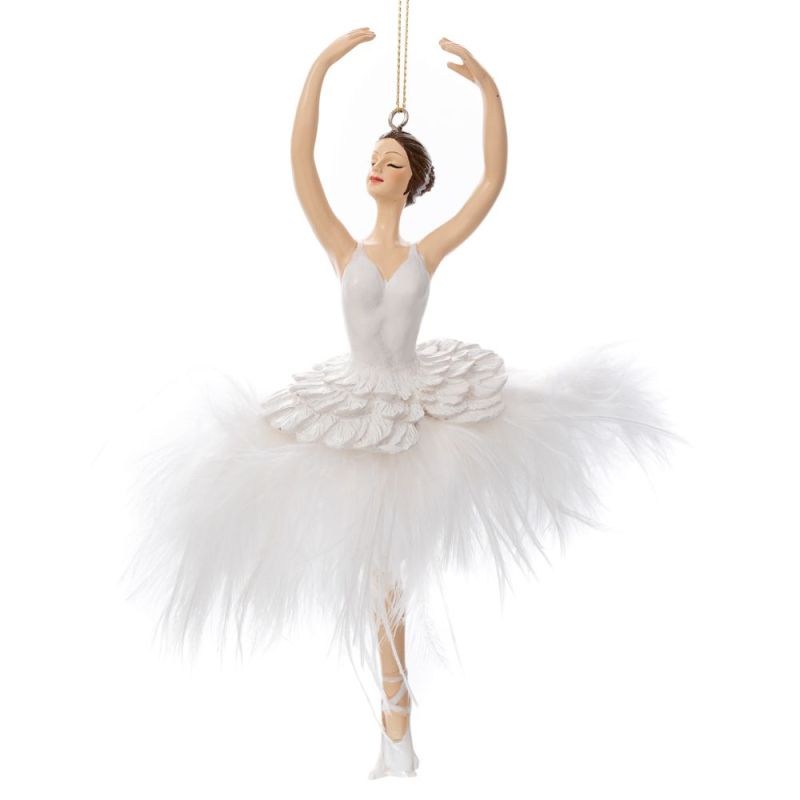 КОЛЕДНА БЯЛА УКРАСА ОТ ПОЛИРЕЗИН С ТАНЦЬОРКА С ПЕРА 8,5Х6,5Х21СМ
