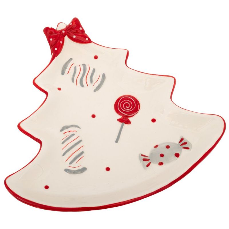 КОЛЕДНА БЯЛА ЧЕРВЕНА КЕРАМИЧНА ЧИНИЯ С ФОРМА НА ЕЛХА С БОНБОНИ 26X25X3 СМ