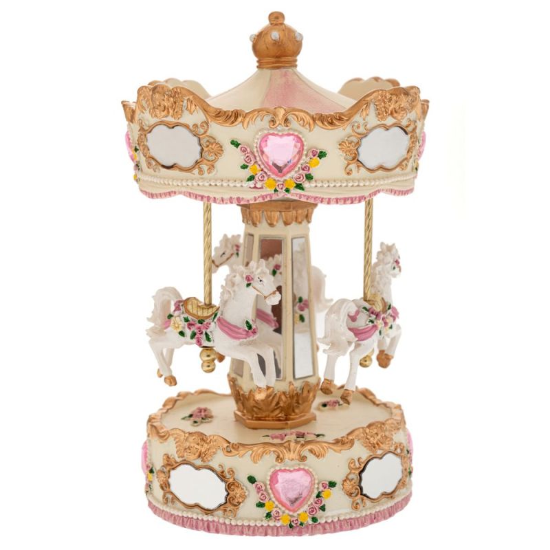 КОЛЕДНА ВЪРТЕЛЕЖКА ОТ ПОЛИРЕЗИН С БЯЛО ЗЛАТО С КОНЕ, С МУЗИКА И ДВИЖЕНИЕ 14X14X25 СМ