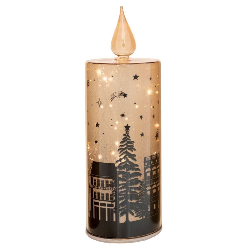 КОЛЕДНА ЗЛАТНА LEDСТЪКЛЕНА СВЕЩ С КОЛЕДЕН ПЕЙЗАЖ 9X9X27 СМ, С БАТЕРИЯ
