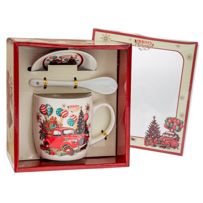 КОЛЕДНА КЕРАМИЧНА ЧАША С ЛЪЖИЦА И ЧИНИЯ В ПОДАРЪЧНА КУТИЯ