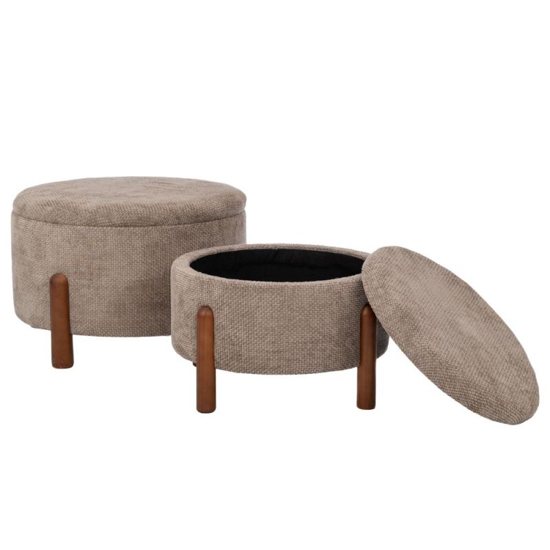 КОМПЛЕКТ ОТ 2 КРЪГЛИ ТАБУРЕТКИ С ДЪРВЕНИ КРАКА И МЯСТО ЗА СЪХРАНЕНИЕ Р56X35СМ Д45X30СМ