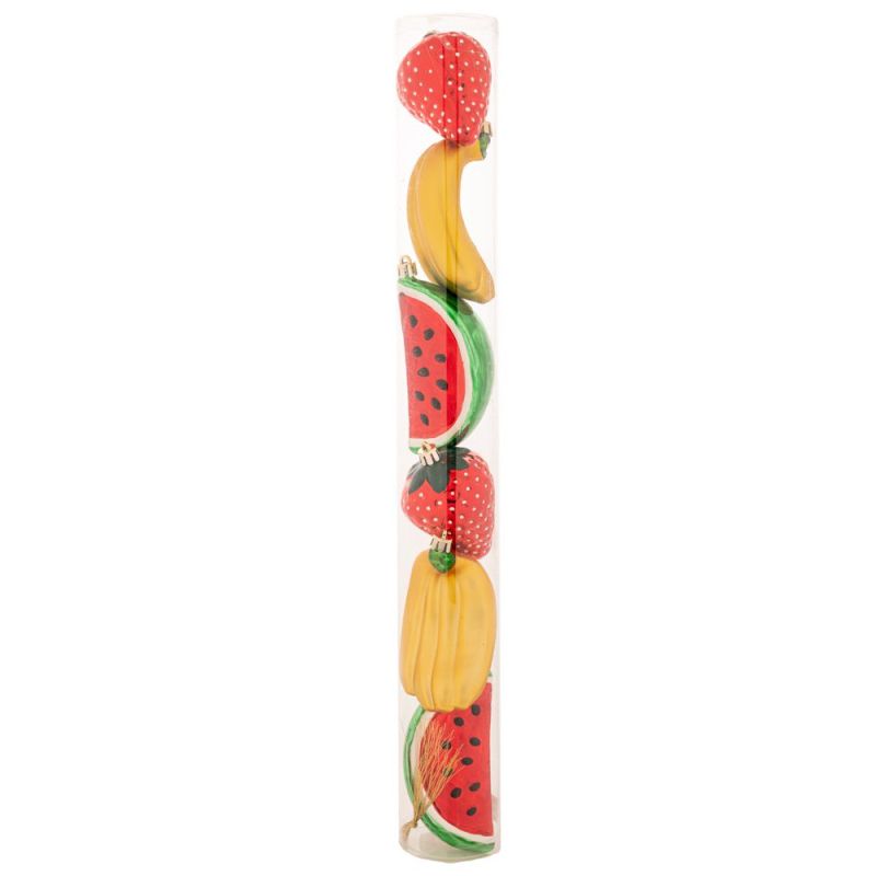 КОМПЛЕКТ ОТ 6 ЧЕРВЕНИ, ЖЪЛТИ, СРЕБЪРНИ, БЛЕСТЯЩИ ПЛАСТМАСОВИ УКРАСИ С ПЛОДОВЕ В КУТИЯ