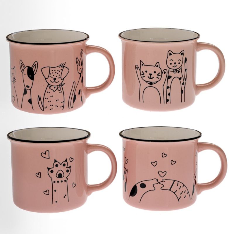 РОЗОВА КЕРАМИЧНА ЧАША С ФИГУРКА НА КОТКА И КУЧЕ 460 МЛ