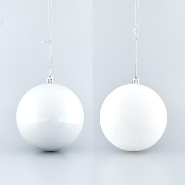 КОЛЕДНА БЯЛА ТОПКА, ПЛАСТМАСА, КОМПЛЕКТ ОТ 6 БРОЯ, (2 ПЕРЛЕНИ, 4 БЛЕСТЯЩИ), 10 см