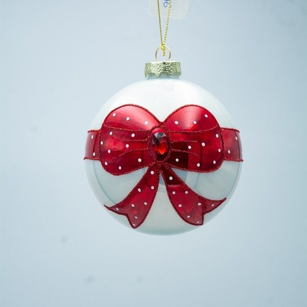 КОЛЕДНА СТЪКЛЕНА ТОПКА, БЯЛА С ЧЕРВЕНА ПАНДЕЛХА, КОМПЛЕКТ ОТ 4 БРОЯ, 10 СМ