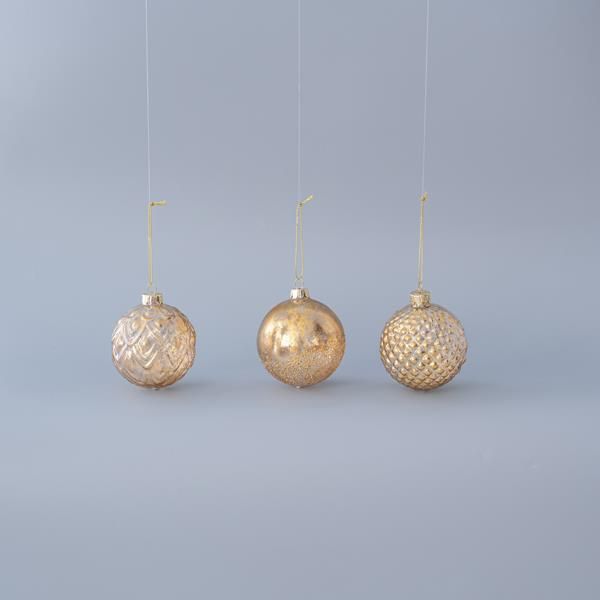 КОЛЕДНА СТЪКЛЕНА ТОПКА, ПРОЗРАЧНО ЗЛАТО, РЕЛЕФ, 3 ДИЗАЙНА, КОМПЛЕКТ ОТ 4 БРОЯ, 8 см