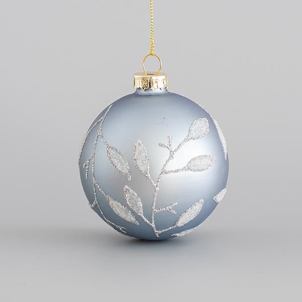 КОЛЕДНА СТЪКЛЕНА ТОПКА, СВЕТЛОСИНЯ МАТОВА, С БЛЕСТЯЩИ ЛИСТА, КОМПЛЕКТ ОТ 4 БРОЯ, 8 см