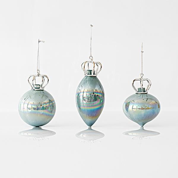 КОЛЕДНА СТЪКЛЕНА УКРАСА, ПРЕЛИВАЩА, МЕНТА, С КОРОНА, 3 ФОРМИ, КОМПЛЕКТ ОТ 4 БРОЯ, 10 И 14,8 СМ