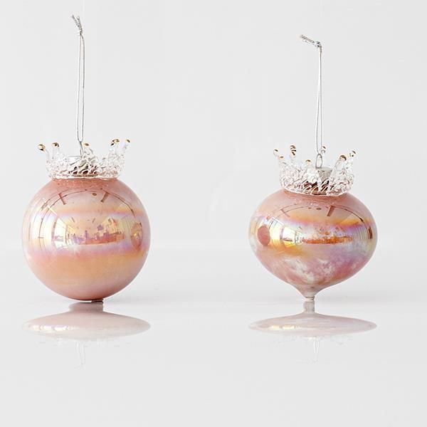 КОЛЕДНА СТЪКЛЕНА УКРАСА, ПРЕЛИВАЩА, РОЗОВА, С КОРОНА, 2 ФОРМИ, КОМПЛЕКТ ОТ 2 БР., 8x9,5 см