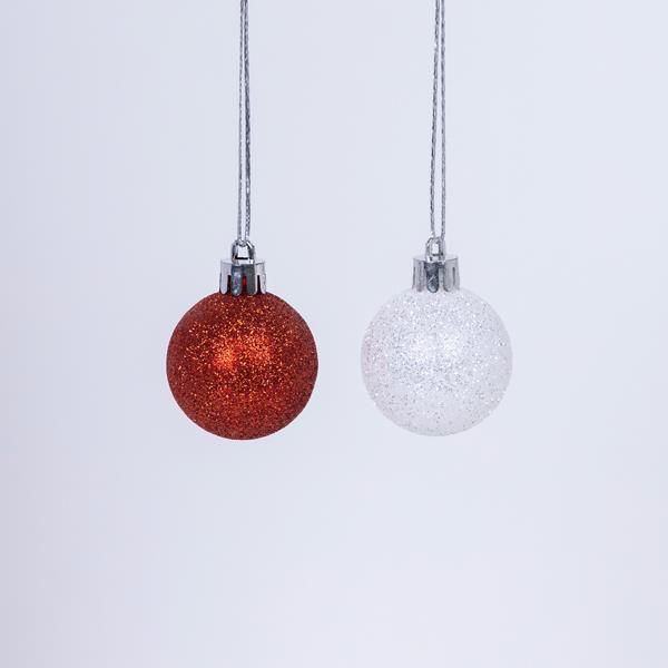 КОЛЕДНИ ПЛАСТМАСОВИ ТОПКИ, БЯЛО ЧЕРВЕНИ, С БЛЕСТЯЩИ ПАРЧЕНЦА, КОМПЛЕКТ 6 БРОЯ, 4 см (ТОП 120)