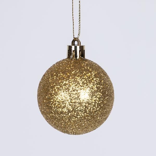 КОЛЕДНИ ПЛАСТМАСОВИ ТОПКИ, ЗЛАТНИ, С БЛЕСТЯЩИ ПАРЧЕНЦА, КОМПЛЕКТ 6 БР., 8 см (ТОП 120)