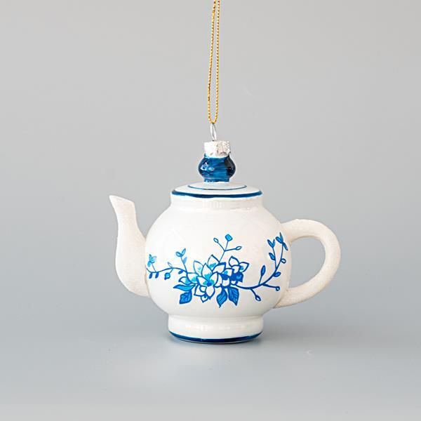 СТЪКЛЕНА УКРАСА, ЧАЙНИК, СЪС СИНИ ЦВЕТЯ, КОМПЛЕКТ ОТ 4 БРОЯ, 11X7,5X10СМ