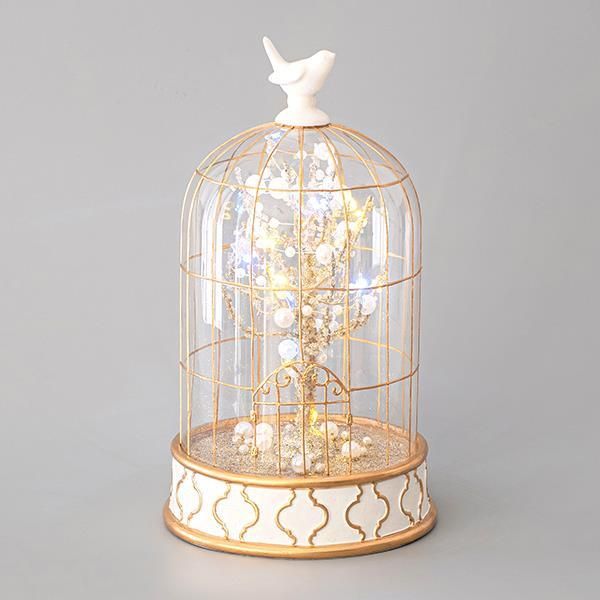 НАСТОЛНА СТЪКЛЕНА ДЕКОРАЦИЯ С ПТИЧА КЛЕТКА, С ПТИЦА И ПЕРЛЕНО ДЪРВО, 12 LED ЛУМИ, 14,6X24СМ