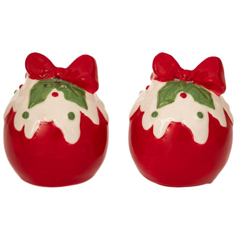 КОМПЛЕКТ ОТ 2 ЧЕРВЕНО-БЕЛИ КЕРАМИЧНИ КОЛЕДНИ СОЛНИЦА И ПИПЕР, ПОДАРЪЧЕН ДИЗАЙН 5X5X7 СМ