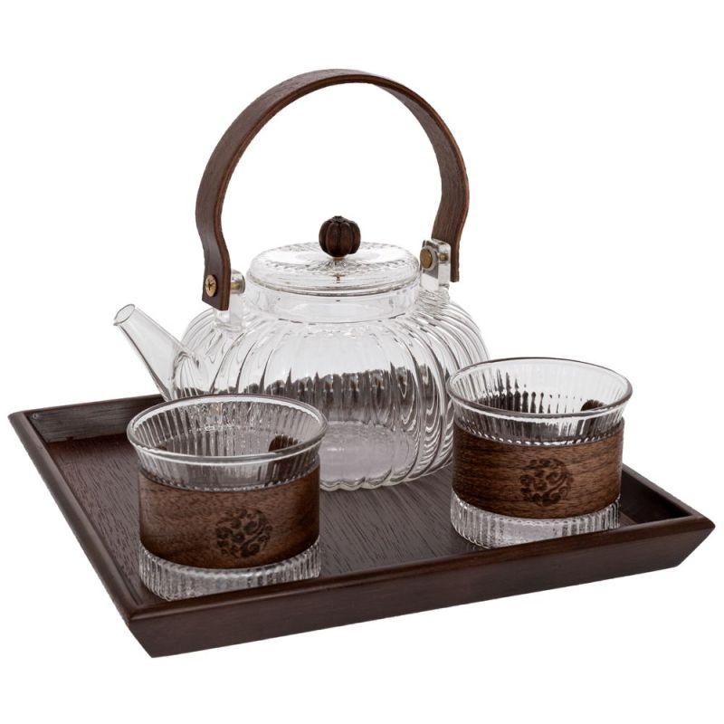 КОМПЛЕКТ ОТ 4 ЧАСТИ, ДЪРВЕН ПОДНОС СЪС СТЪКЛЕН ЧАЙНИК И ЧАШИ 23,5X23,5X11СМ