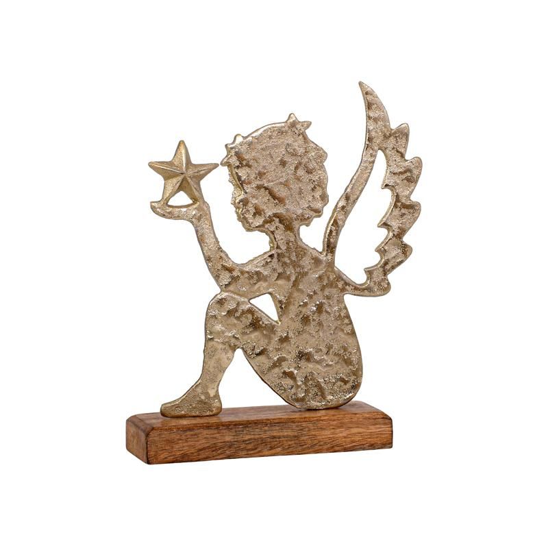 КОЛЕДЕН ДЕКОРАТИВЕН АЛУМИНИЕВ АНГЕЛ С ДЪРВЕНА ОСНОВА FL1723 ЗЛАТИСТ ЦВЯТ 14x5x18см
