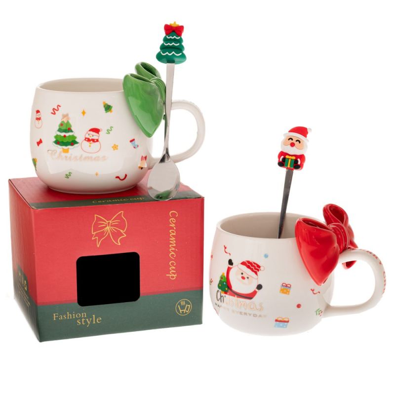 КОЛЕДНА БЯЛА КЕРАМИЧНА ЧАША С ПАПИОНКА И ЛЪЖИЦА, 4 ДИЗАЙНА 1/В КУТИЯ
