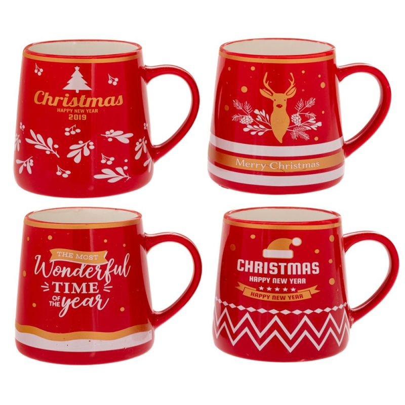 КОЛЕДНА ЧЕРВЕНА КЕРАМИЧНА ЧАША С КОЛЕДНИ ФИГУРКИ 4 ДИЗАЙНА 420 МЛ