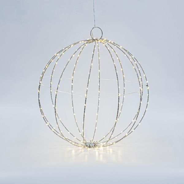 СРЕБЪРНА МЕТАЛНА ТОПКА 40 СМ, 240 МИНИ LED, АДАПТЕР, СРЕБЪРНА МЕДНА ЖИЦА, ТОПЛО БЯЛА LED СВЕТЛИНА, ЖИЛ 3 М, IP44