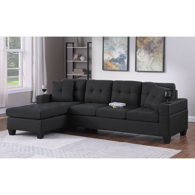 ЪГЛОВ ДИВАН JORDAN, ОБРЪЩАЕМ, ЧЕРЕН ПЛАТ, ПОДЛАКЪТНИЦИ С ПОСТАВКИ ЗА ЧАШИ