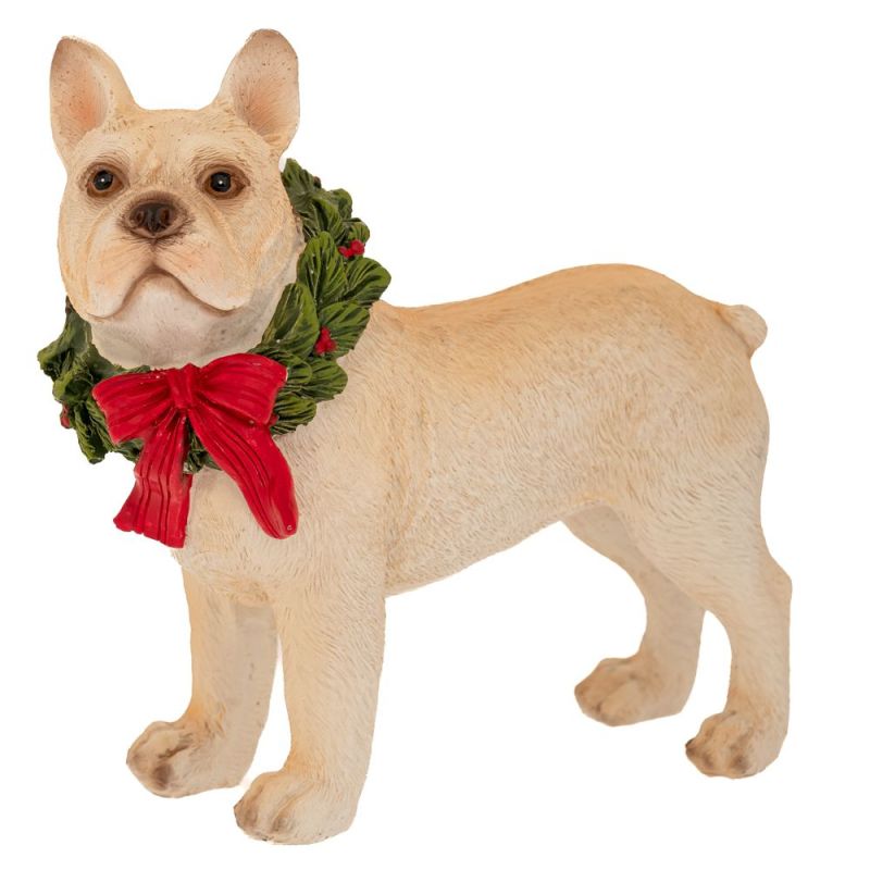 КОЛЕДНА ФИГУРКА НА КУЧЕ ОТ БЯЛ ПОЛИРЕЗИН СЪС ЗЕЛЕН ВЕНЕЦ НА ВРАТА 12X6X12,5 СМ