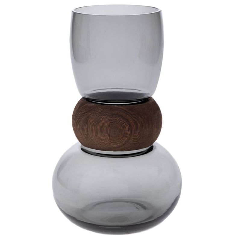 СИВА СТЪКЛЕНА ВАЗА С ДЪРВЕНА ДЕКОРАЦИЯ 16X33СМ
