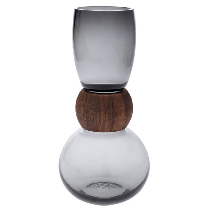 СИВА СТЪКЛЕНА ВАЗА С ДЪРВЕНА ДЕКОРАЦИЯ 16X33СМ