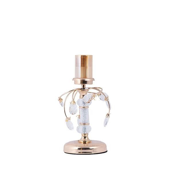 СТЪКЛЕН СВЕЩНИК С КРИСТАЛНИ ДЕТАЙЛИ, МЕТАЛНА ОСНОВА, ЗЛАТИСТО-БЯЛО-КЕХЛИБАРЕНО СТЪКЛО 12X32СМ