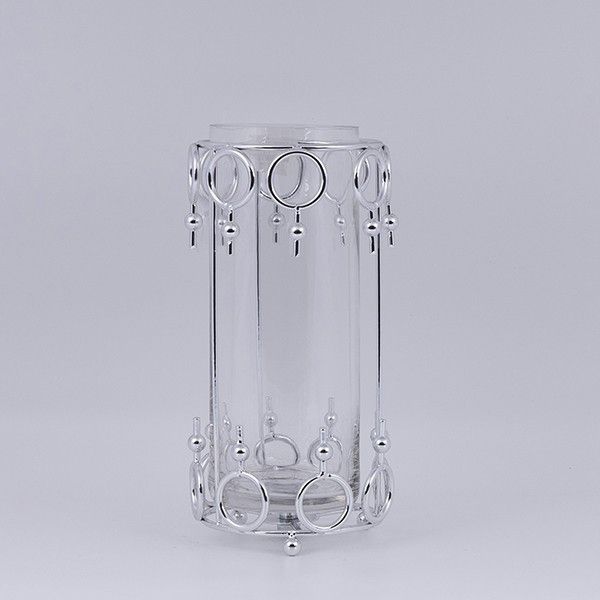 СТЪКЛЕН СВЕЩНИК С МЕТАЛНИ АКЦЕНТИ, СРЕБЪРНО, 12X27 СМ