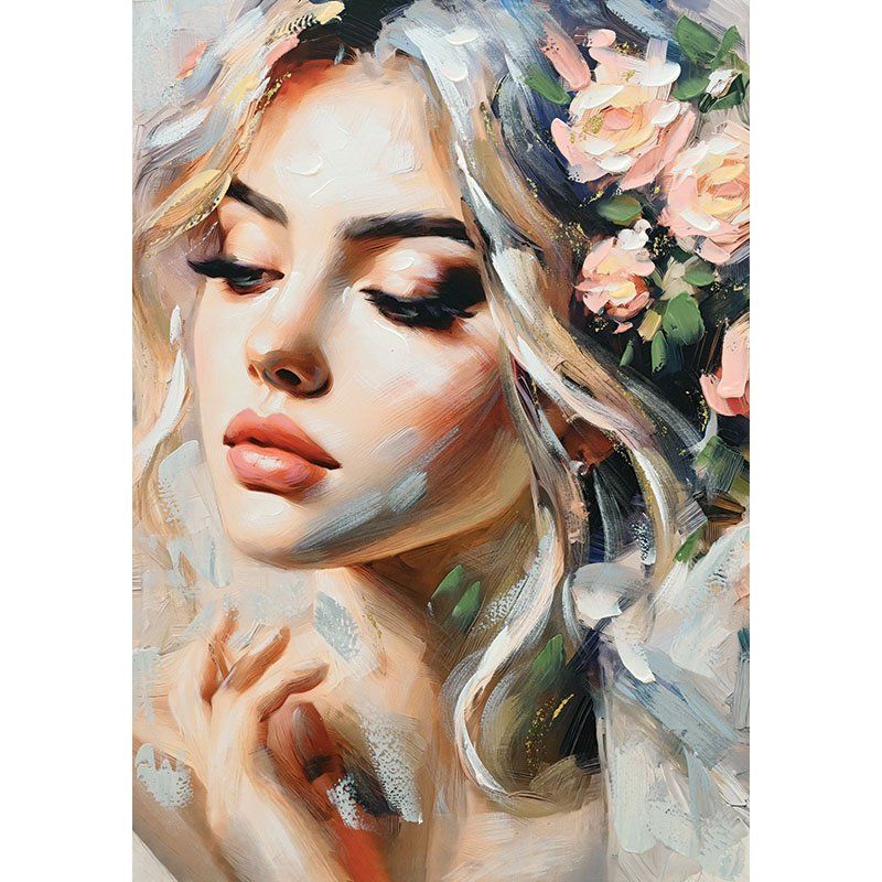 БЕЖОВА КАРТИНА ВЪРХУ ПЛАТНО КРАСИВА ЖЕНА С ЦВЕТЯ НА ГЛАВАТА 70x100 СМ 8/KIB