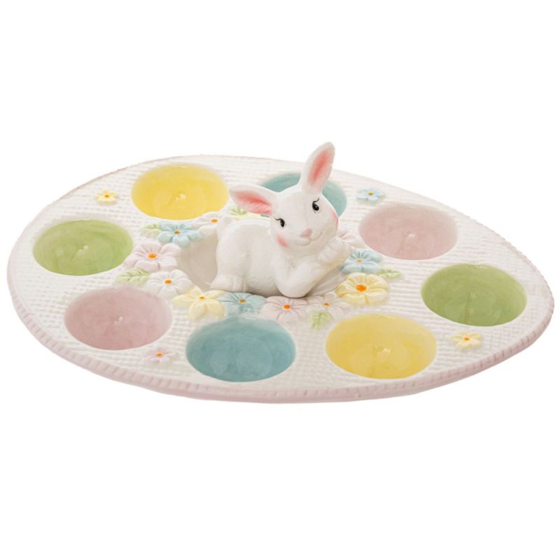БЯЛА КЕРАМИЧНА ПОСТАВКА ЗА ВЕЛИКДЕНСКИ ЯЙЦА СЪС ЗАЙЧЕ 25Х19Х8,5 СМ