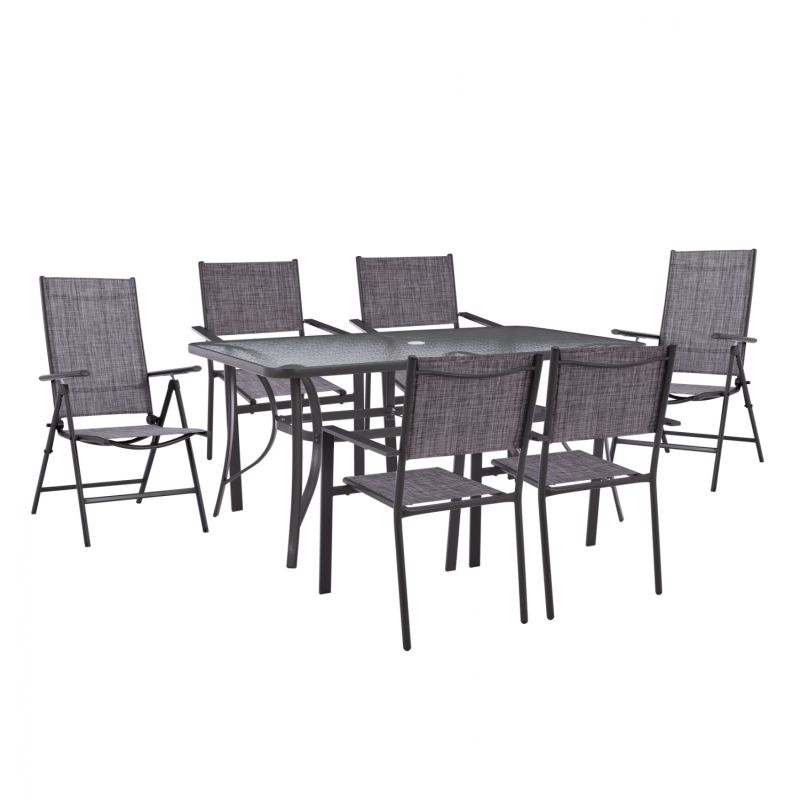ГРАДИНСКИ КОМПЛЕКТ 7 ЧАСТ МАСА 150X90 С МЕТАЛНО СИВИ СГЪВАЕМИ КРОСМЕТИ МЕБЕЛИ HM11481