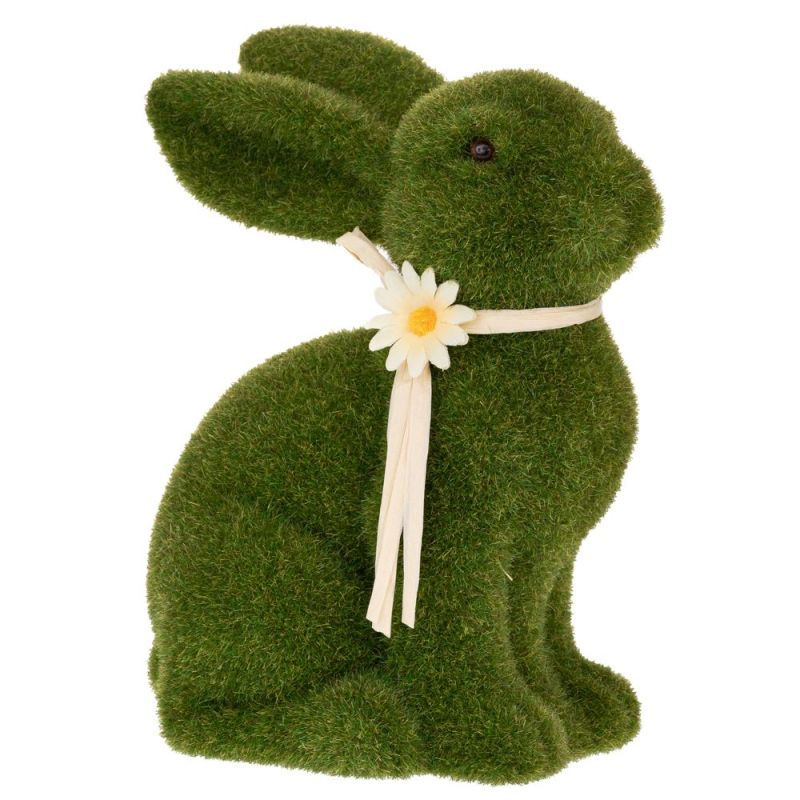 Зелено пликнато седящо зайче с красиви бели цветя великденска декорация 25 см