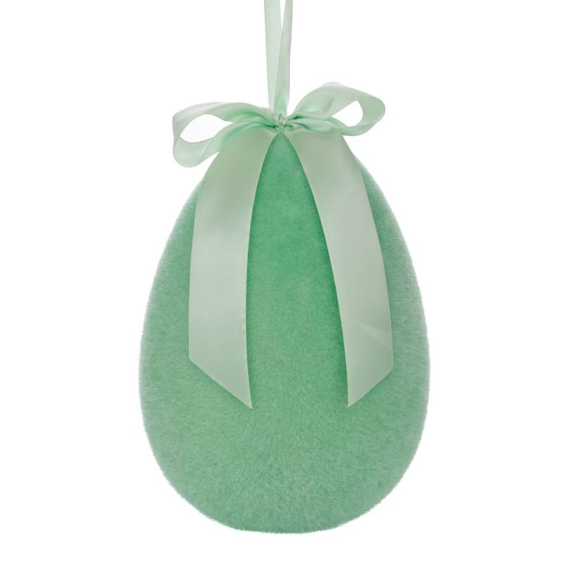 Зелено флокирано висящо яйце с панделка, великденска декорация 20 см