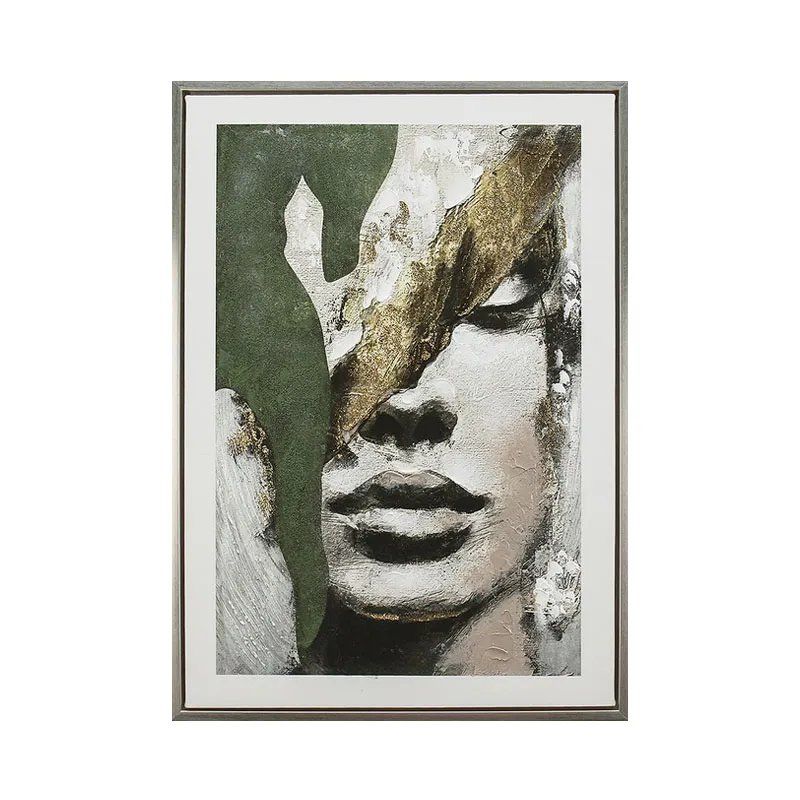 КАРТИНА НА ПЛАТНО С ЛИЦЕ В ЗЕЛЕНО/ЗЛАТНО/СИВО С РЕЛЕФЕН ЕФЕКТ В РАМКА - 50x70x3.8 см 10/КУТИЯ