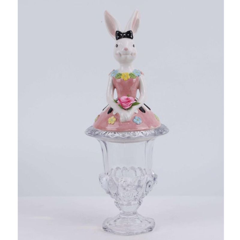 КЕРАМИЧЕН БУРКАН ЗА БИСКВИТКИ С ПРОЗРАЧНО ДЪНО И КАПАК С РОЗОВО ЗАЙЧЕ 16X16X42 СМ
