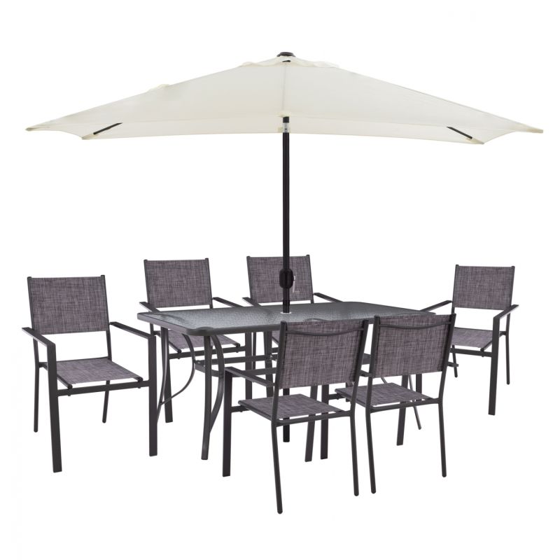 КОМПЛЕКТ МАСА И СТОЛОВЕ 8 ЧАСТИ, МАСА 150X90 С ТЕКСТИЛНИ ФОТЬОЙЛИ, СИВО-БЕЖОВ ЧАДЪР HM11470