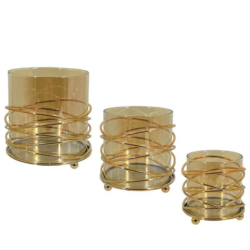 МЕТАЛЕН СВЕЩНИК, ЗЛАТЕН/МЕДЕН, КОМПЛЕКТ/3 ЦИЛИНДЪРА/СИВ СЪС СТЪКЛО - Р:Φ9x9, М:Φ11x11, Д:Φ13x13см 12/КУТИЯ