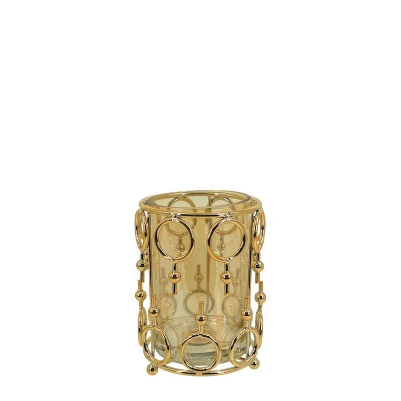 МЕТАЛЕН СВЕЩНИК, ЗЛАТЕН/МЕДЕН, ЦИЛИНДЪР, КРЪГЪЛ, МАЛЪК, СЪС СТЪКЛО - Φ12x17см, 24/КУТИЯ